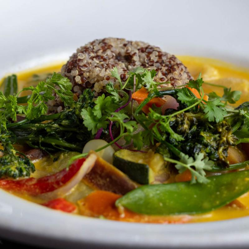 Spring mix greens, topped with seasonal, grilled veggies: broccolini, carrots, snap peas, bell peppers, cauliflower. Served with sliced avocado and plantain chips.